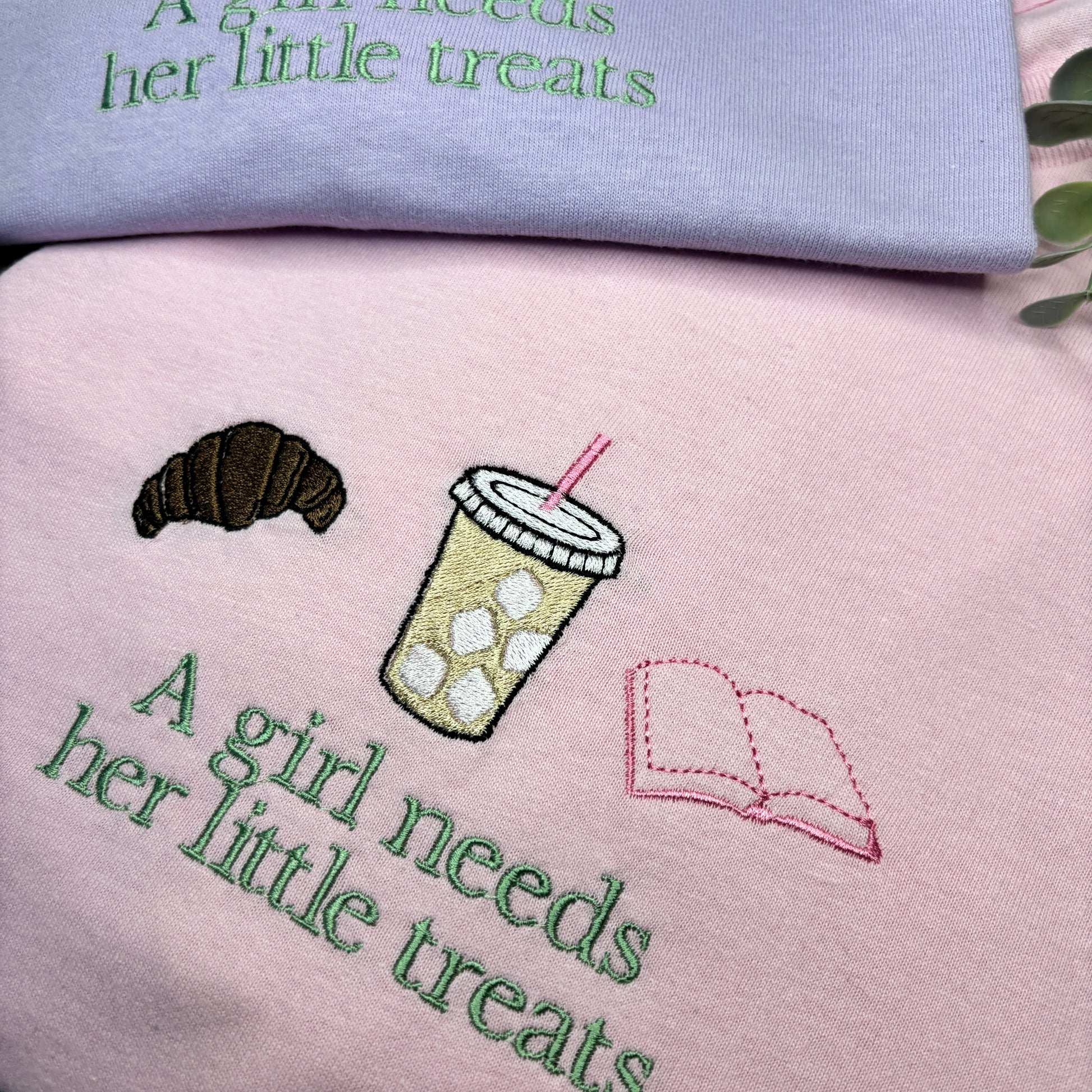 A GIRL NEEDS HER LITTLE TREATS EMBROIDERED SWEATSHIRT