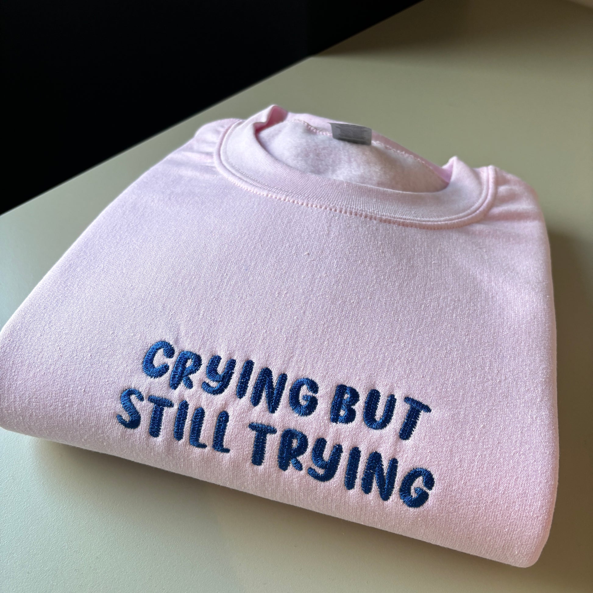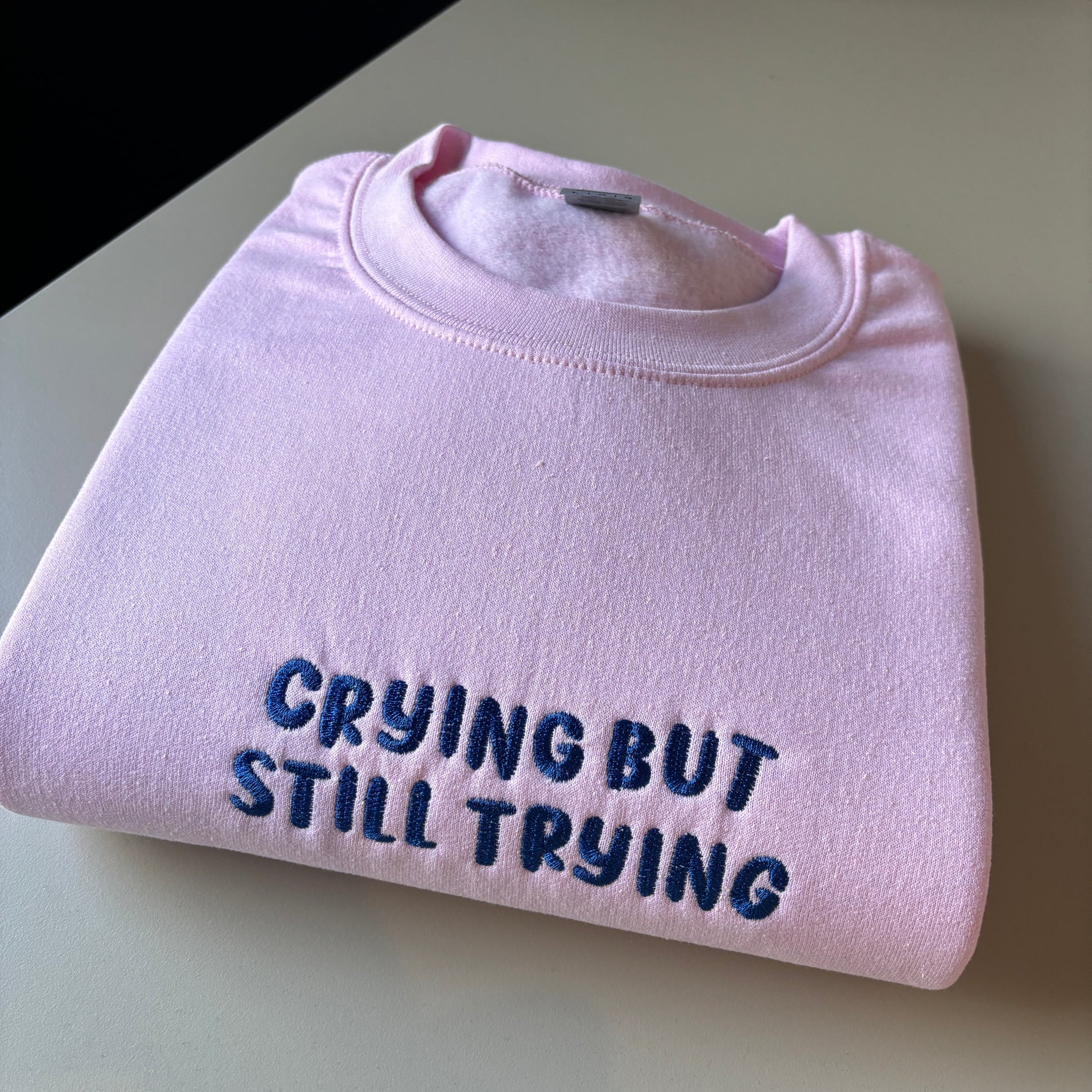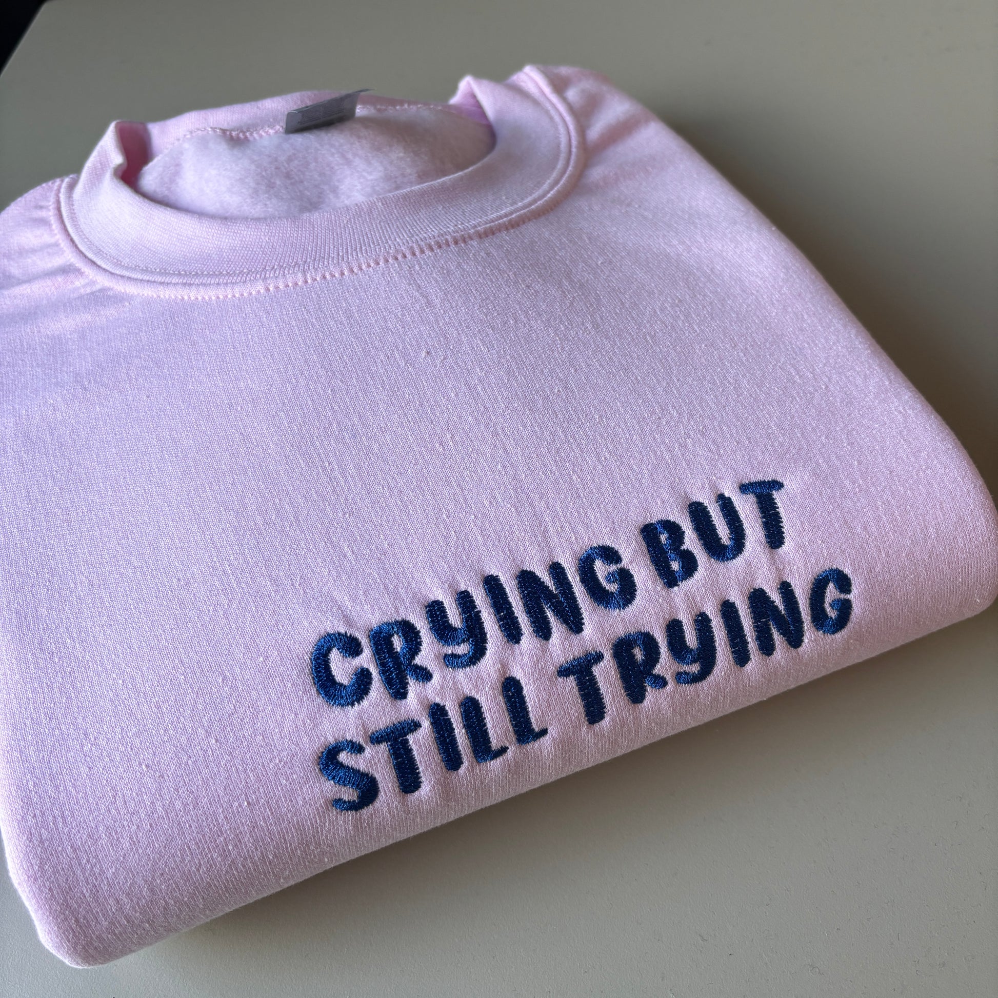 CRYING BUT STILL TRYING EMBROIDERED SWEATSHIRT