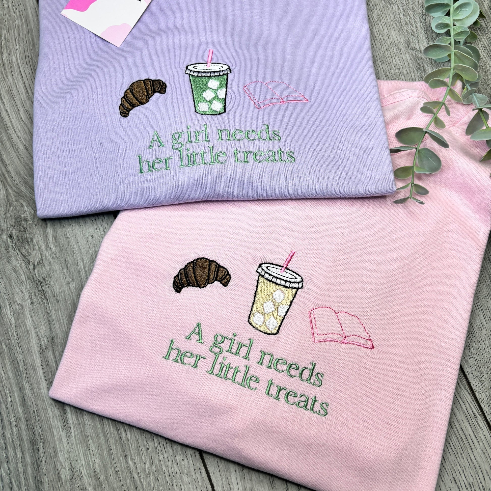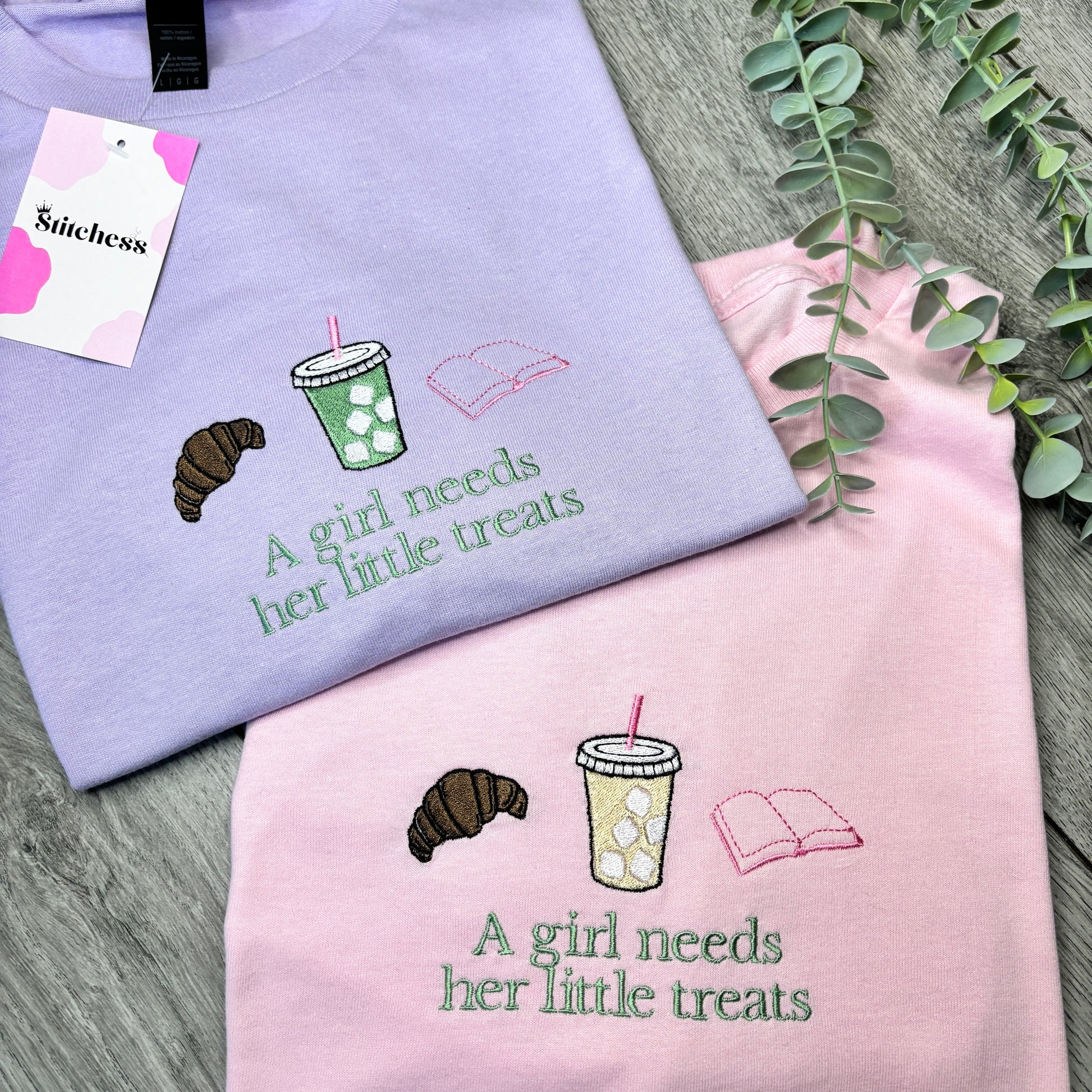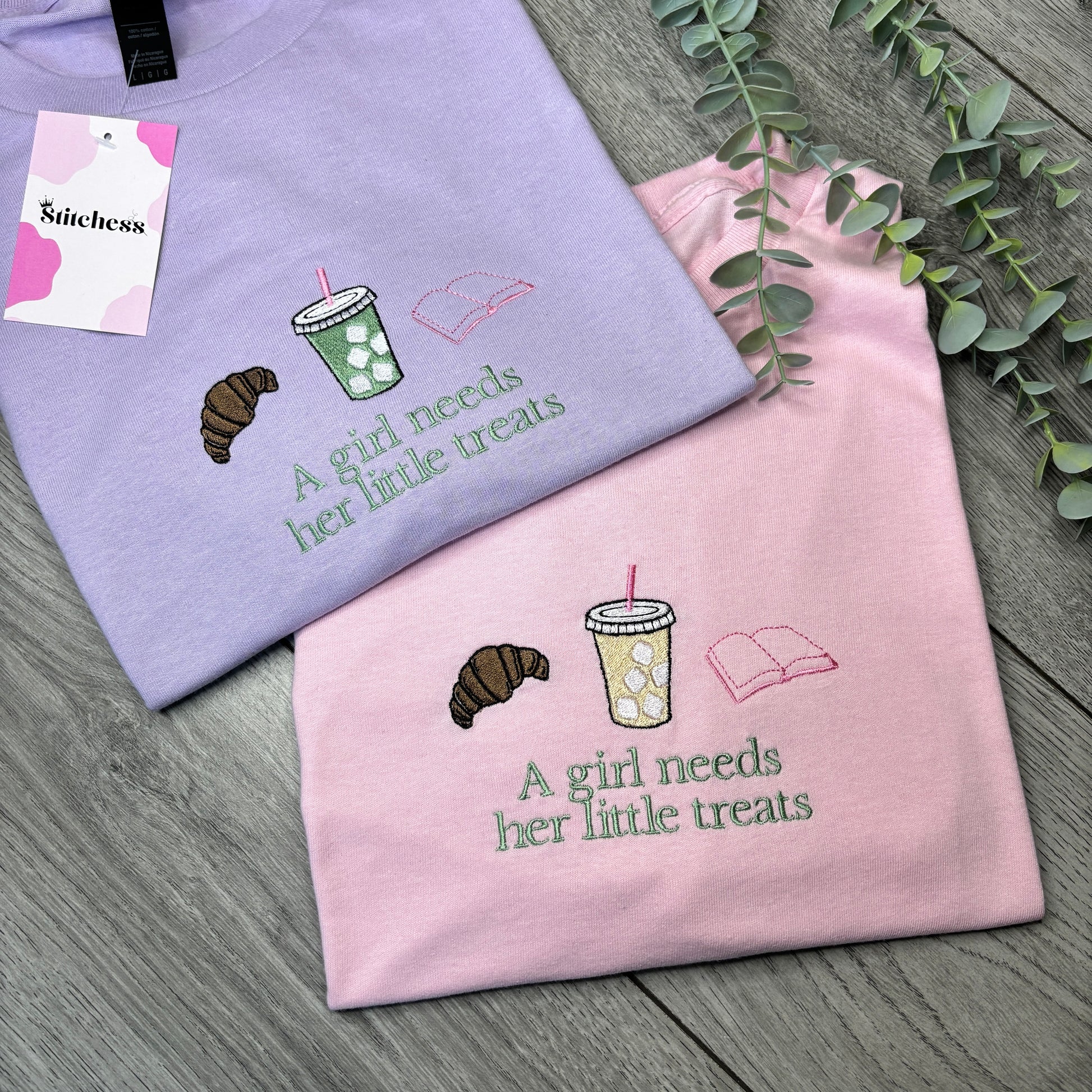 A GIRL NEEDS HER LITTLE TREATS EMBROIDERED T-SHIRT