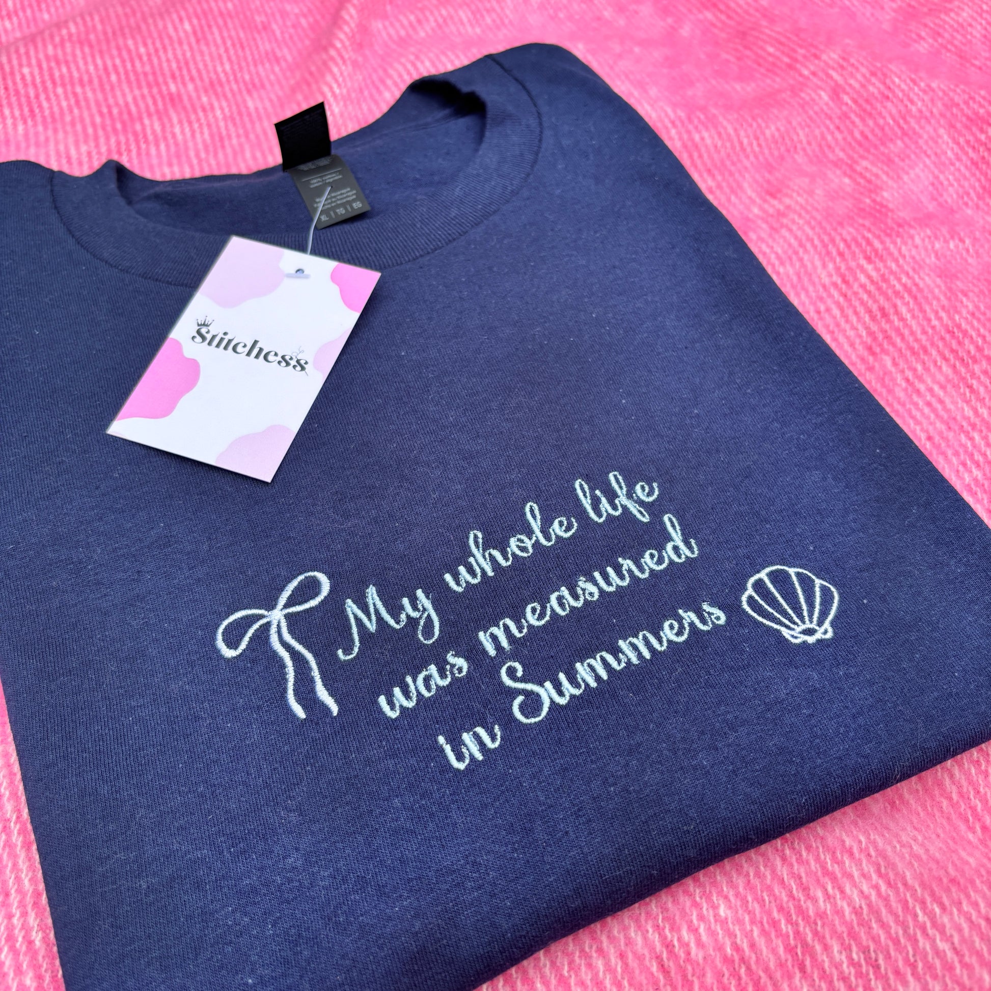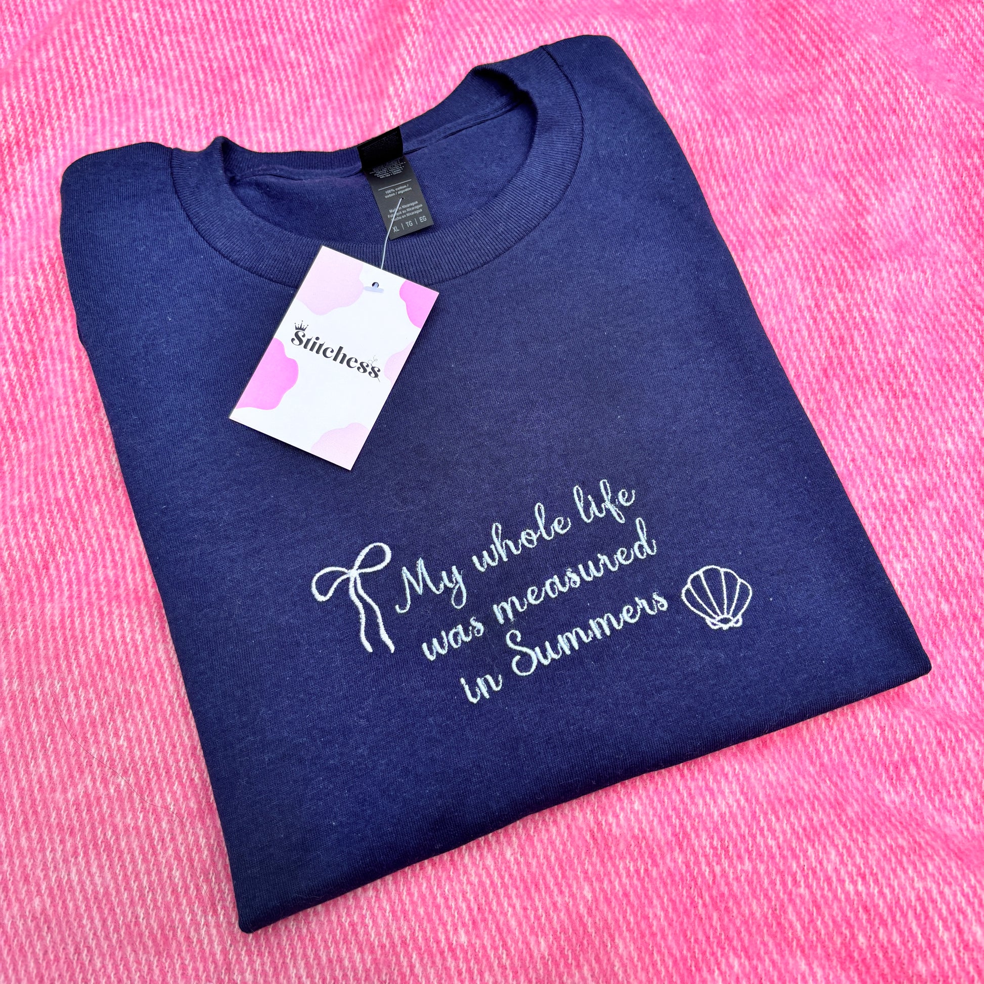 Our" Measured in Summers" t-shirt captures beach memories with pretty bow and shell embroidery 🎀 Comfortable for warm days and cool evenings, it's inspired by coastal vacations and family time. A perfect addition to your summer wardrobe that works from daytime adventures to relaxed evening gatherings.