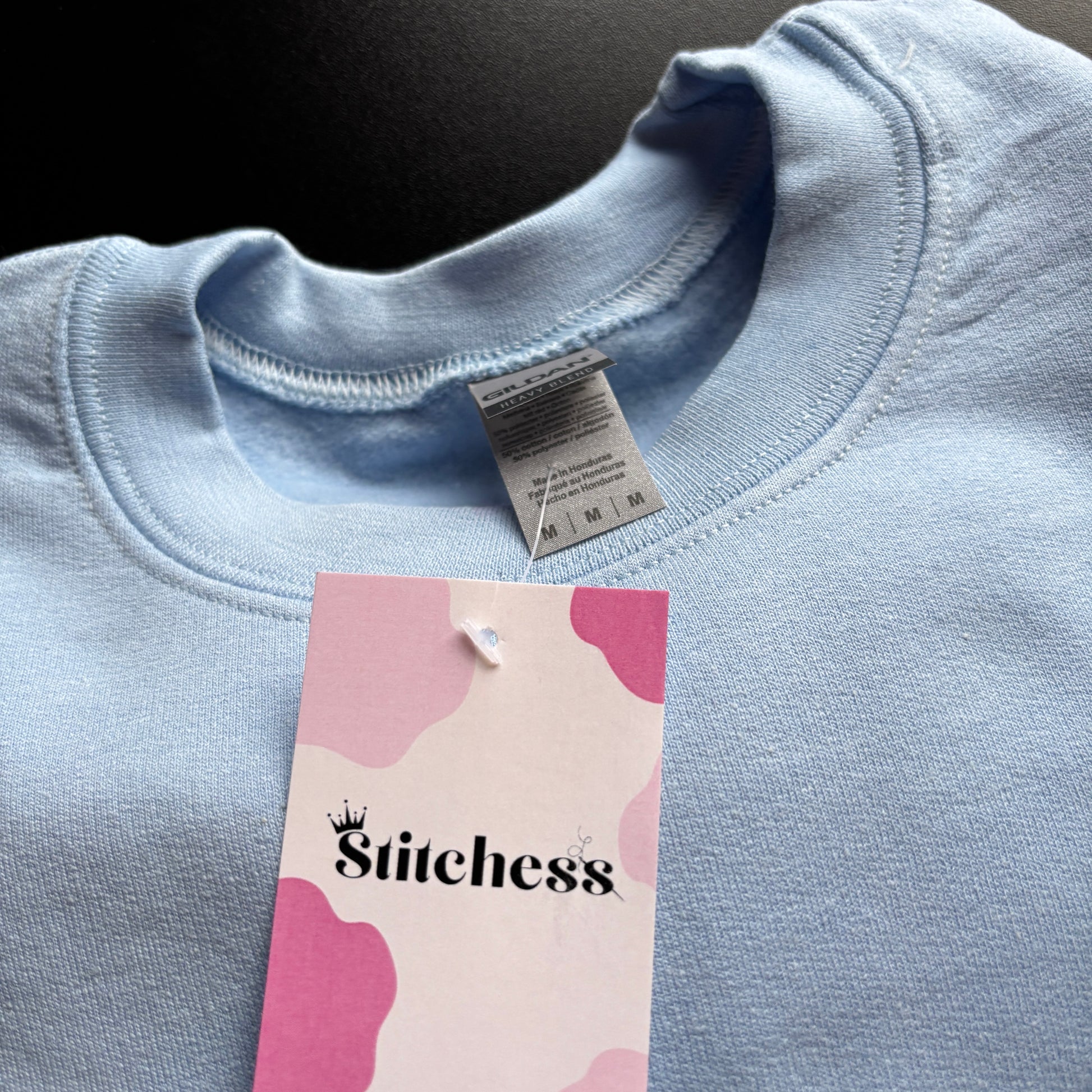 MEDIUM BLUE SORRY I'M LATE EMBROIDERED SWEATSHIRT *SAMPLE*