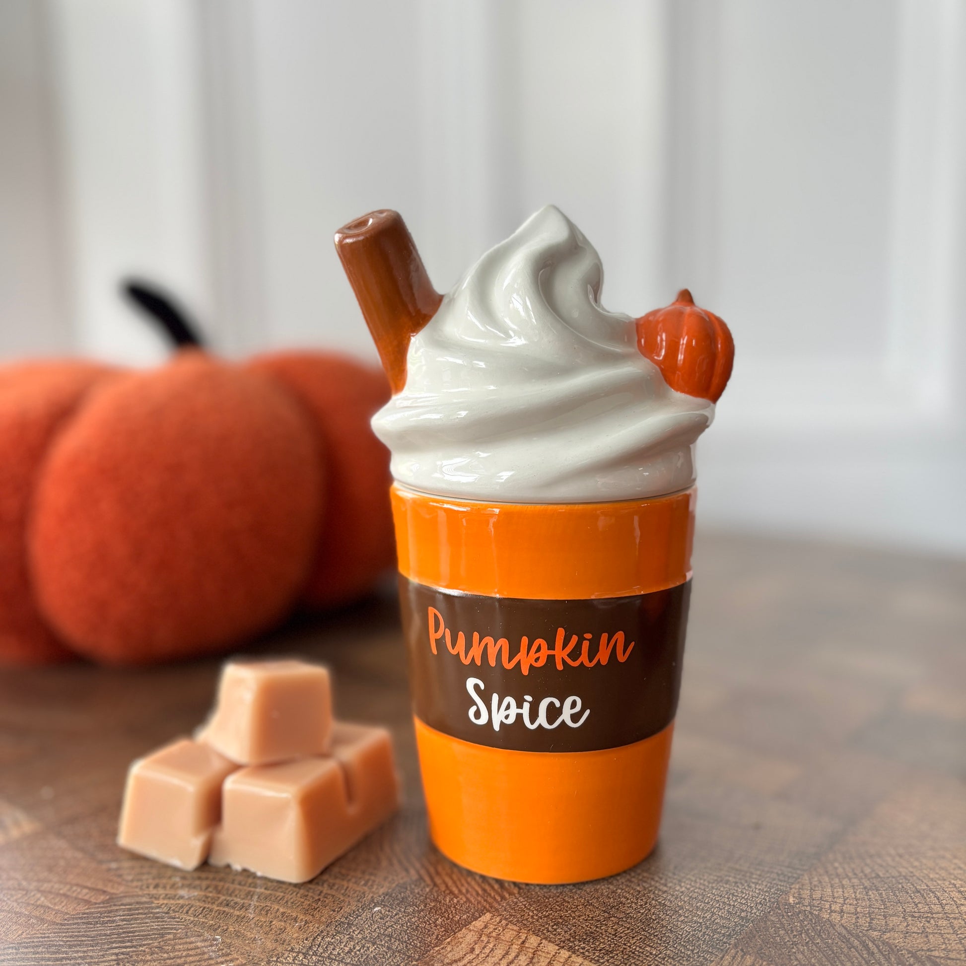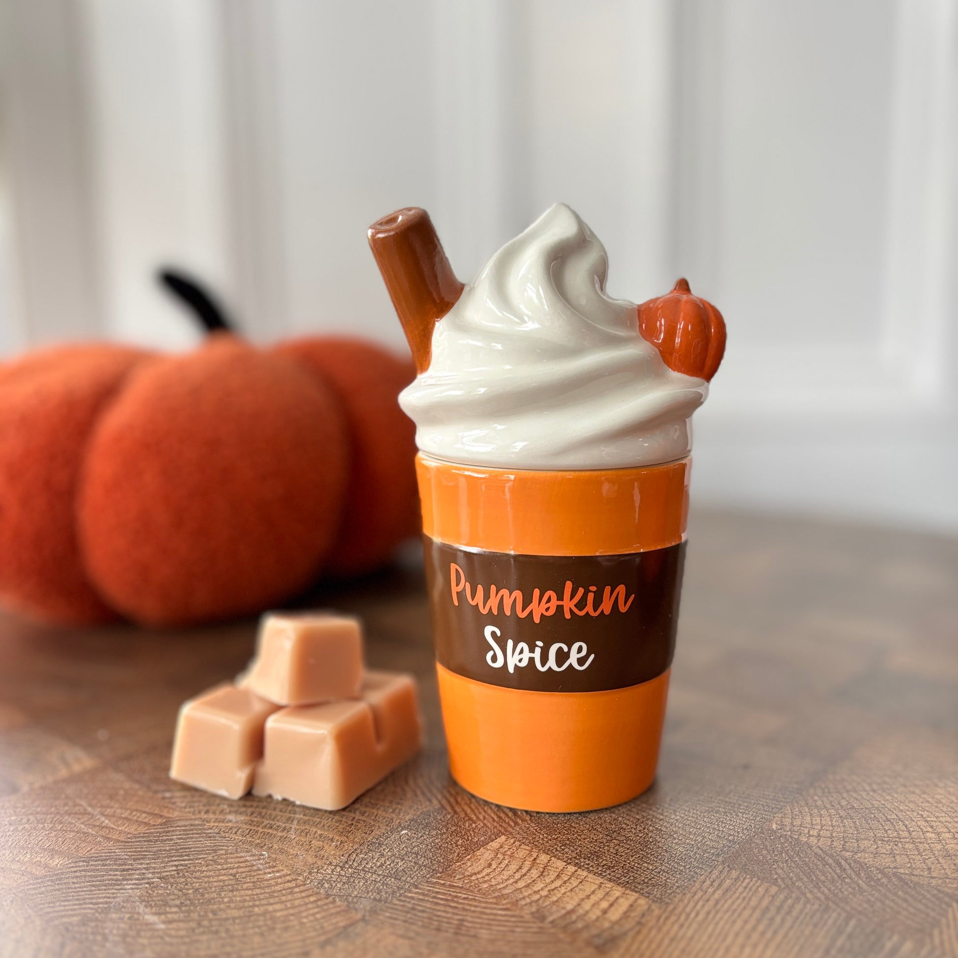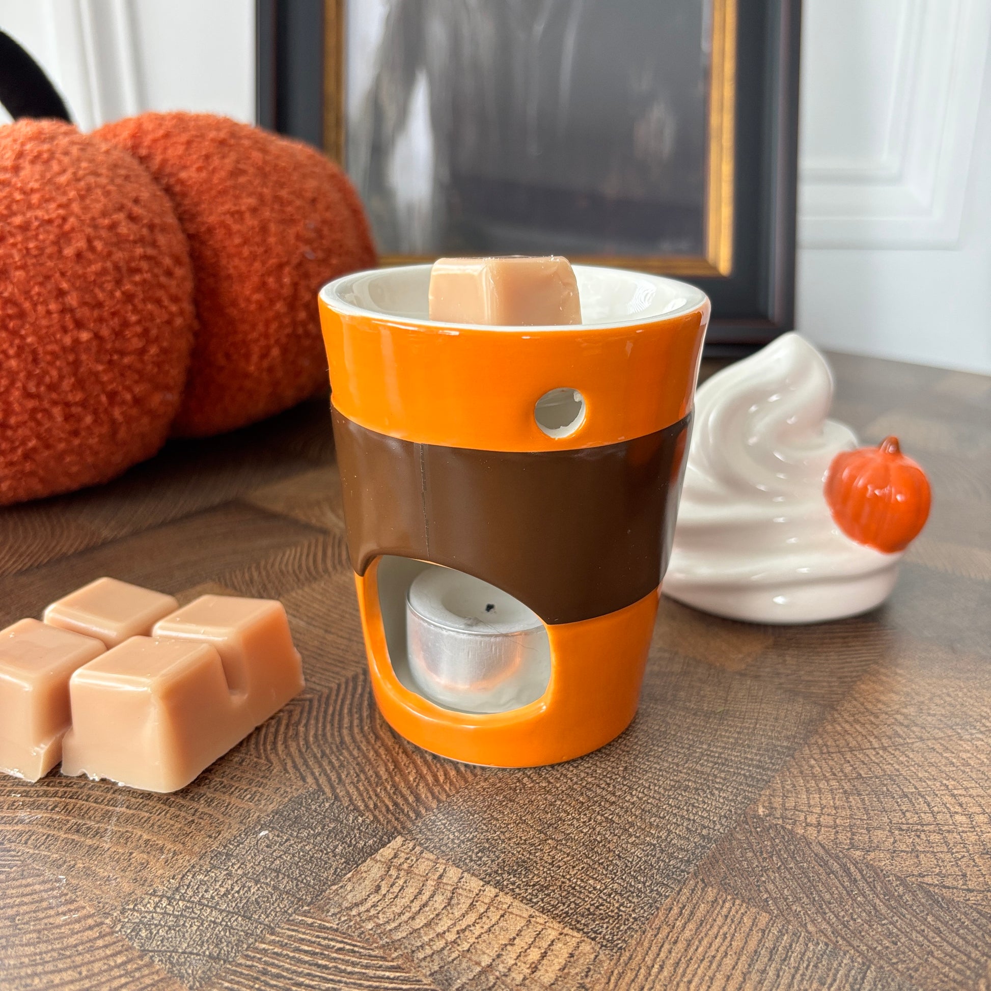 Enhance your home this autumn with this elegant ceramic wax warmer and oil burner, designed as a tempting pumpkin spice latte 🎃 Perfect for coffee enthusiasts, it effortlessly melts seasonal wax melts or fragrance oils, filling your space with inviting, cosy aromas.