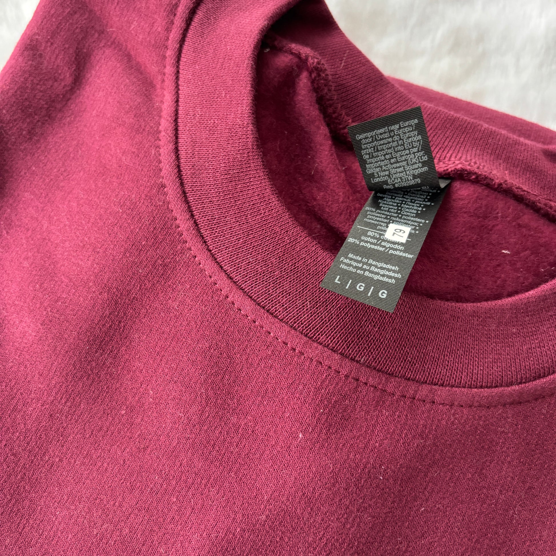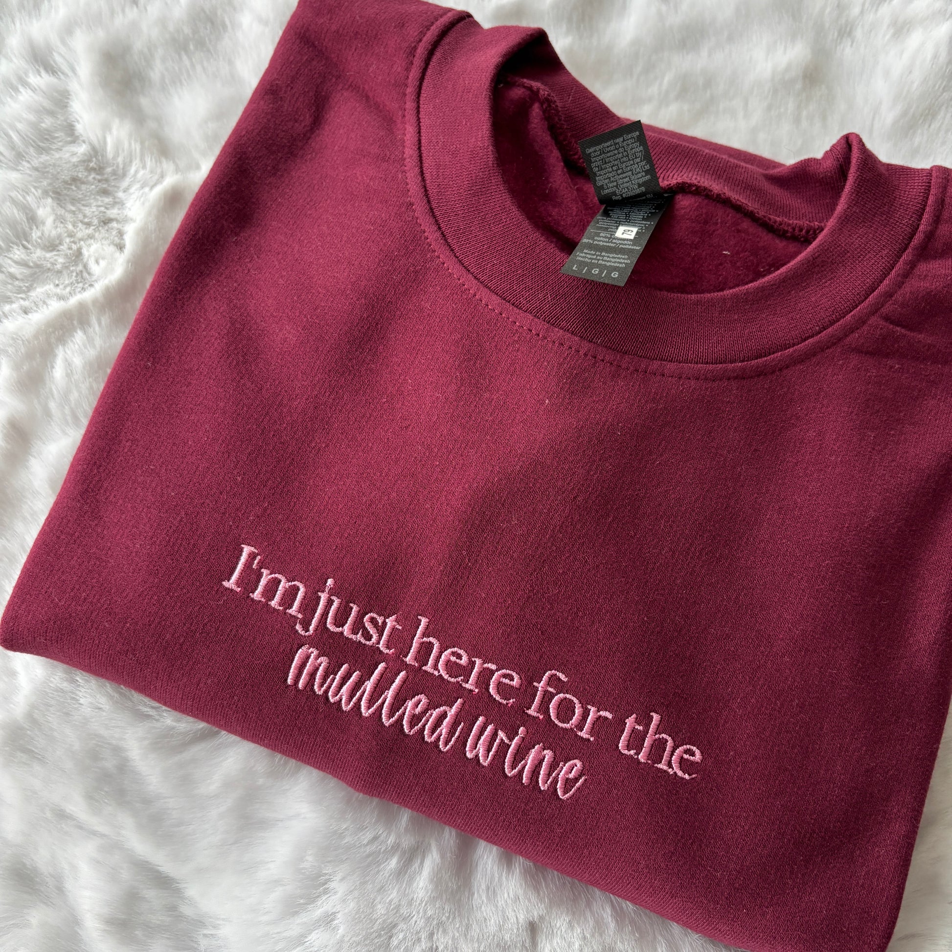READY TO SHIP LARGE BURGUNDY JUST HERE FOR THE MULLED WINE EMBROIDERED SWEATSHIRT