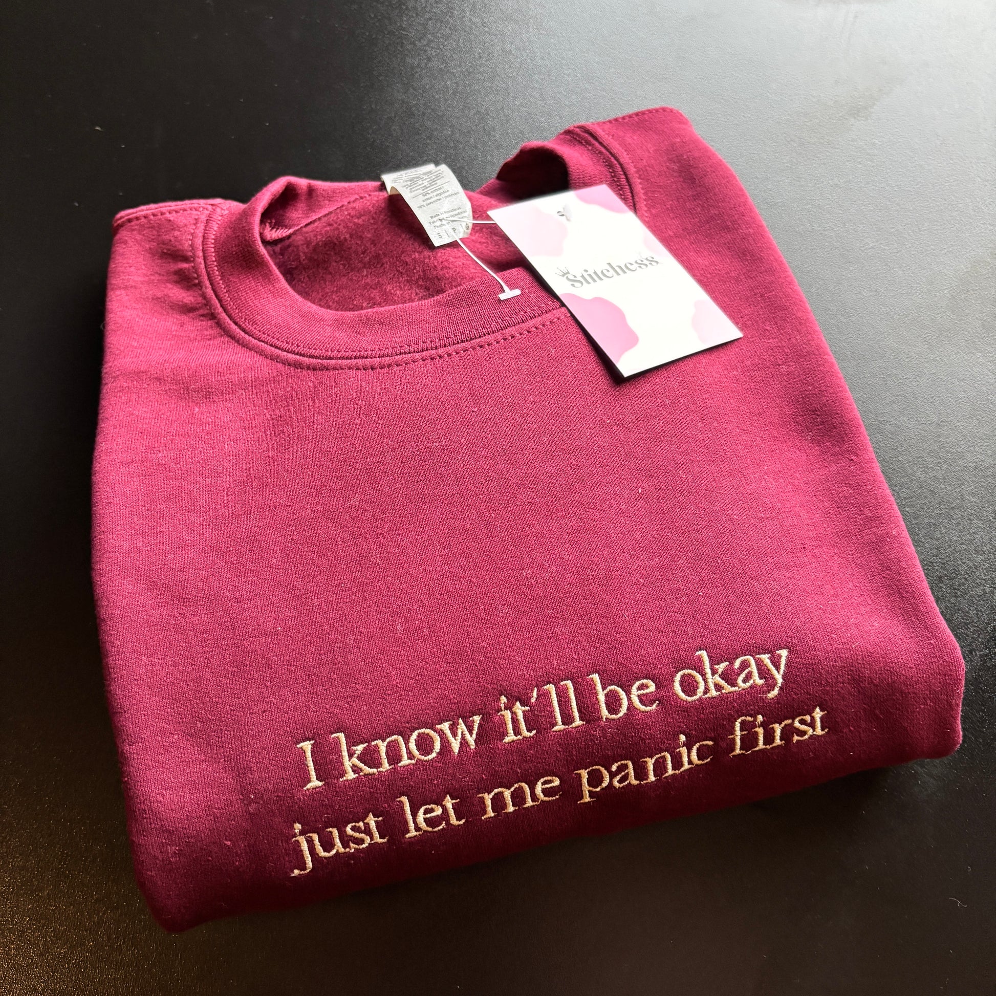 SMALL BURGUNDY LET ME PANIC EMBROIDERED SWEATSHIRT *SAMPLE*