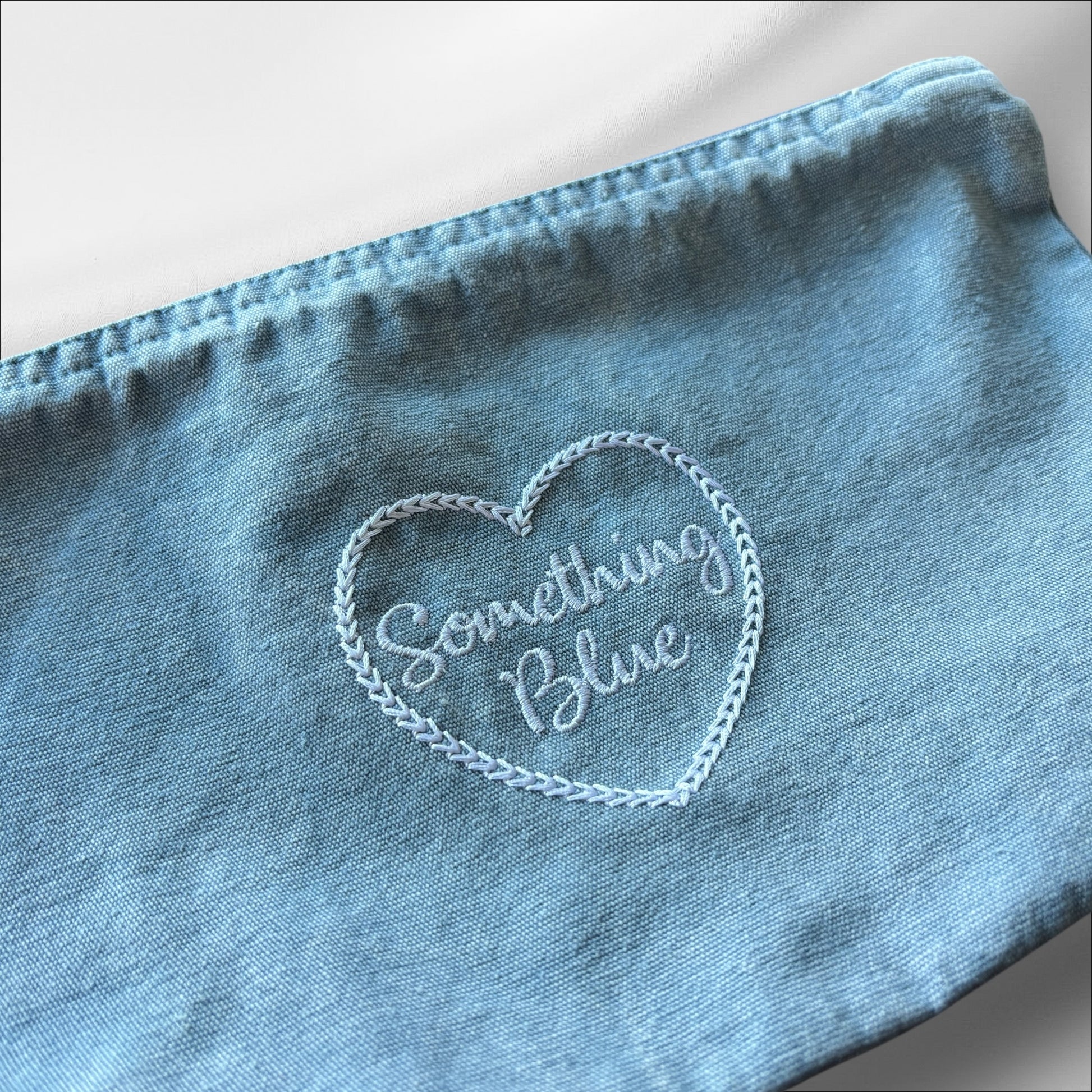 Something blue embroidered makeup/ accessory bag. A beautiful gift for any bride to be! đ°đģââī¸