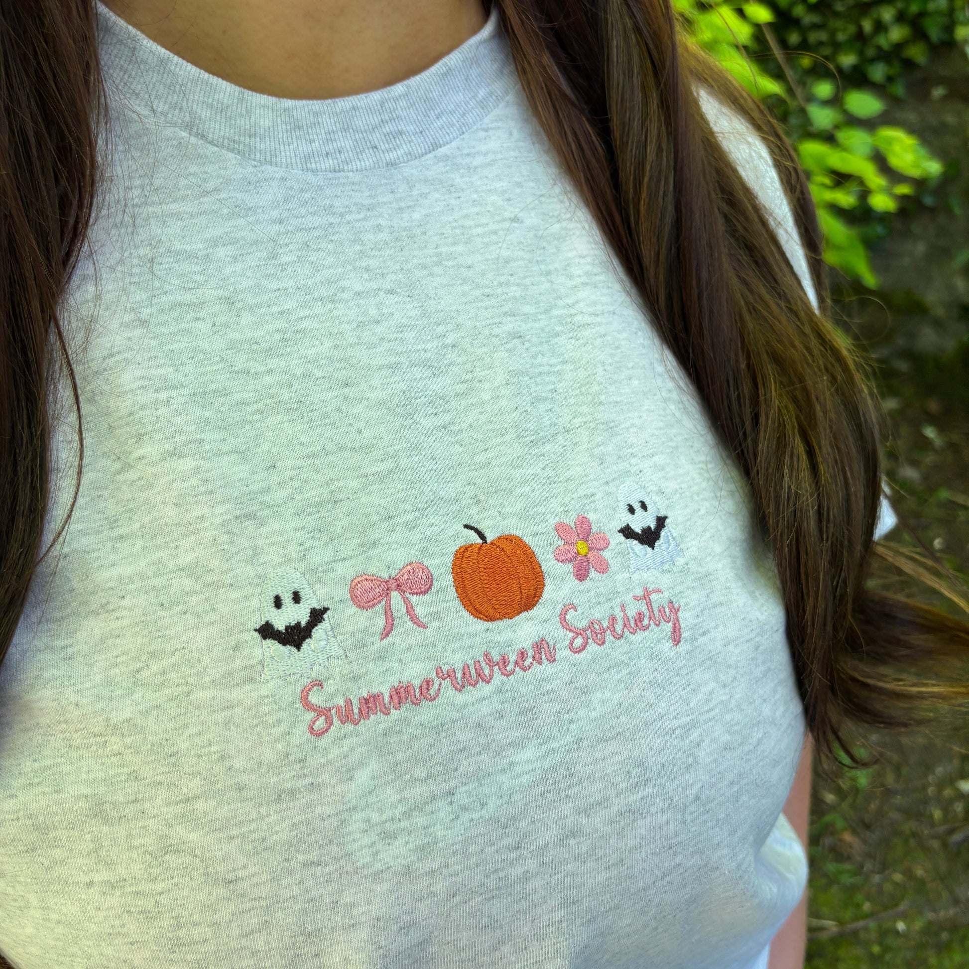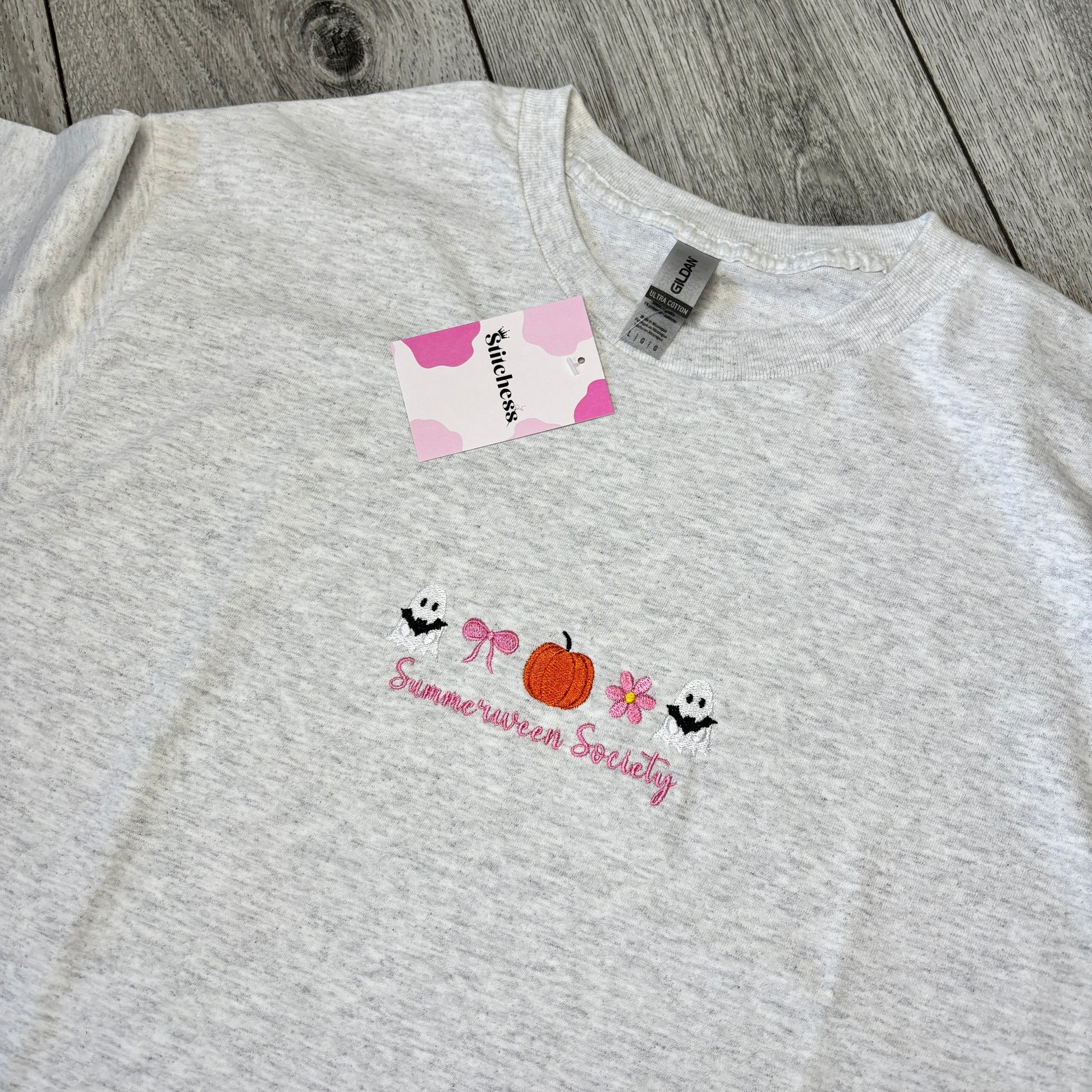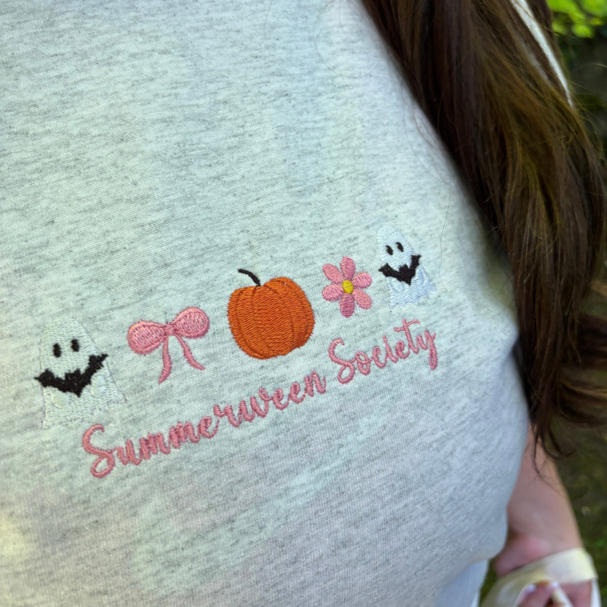 This SUMMERWEEN SOCIETY EMBROIDERED T-SHIRT/SWEATSHIRT is a must-have for Halloween fans. The cute embroidery and little icons make it the perfect choice for celebrating Summerween. Stay cool and stylish this holiday with this adorable top 🎃