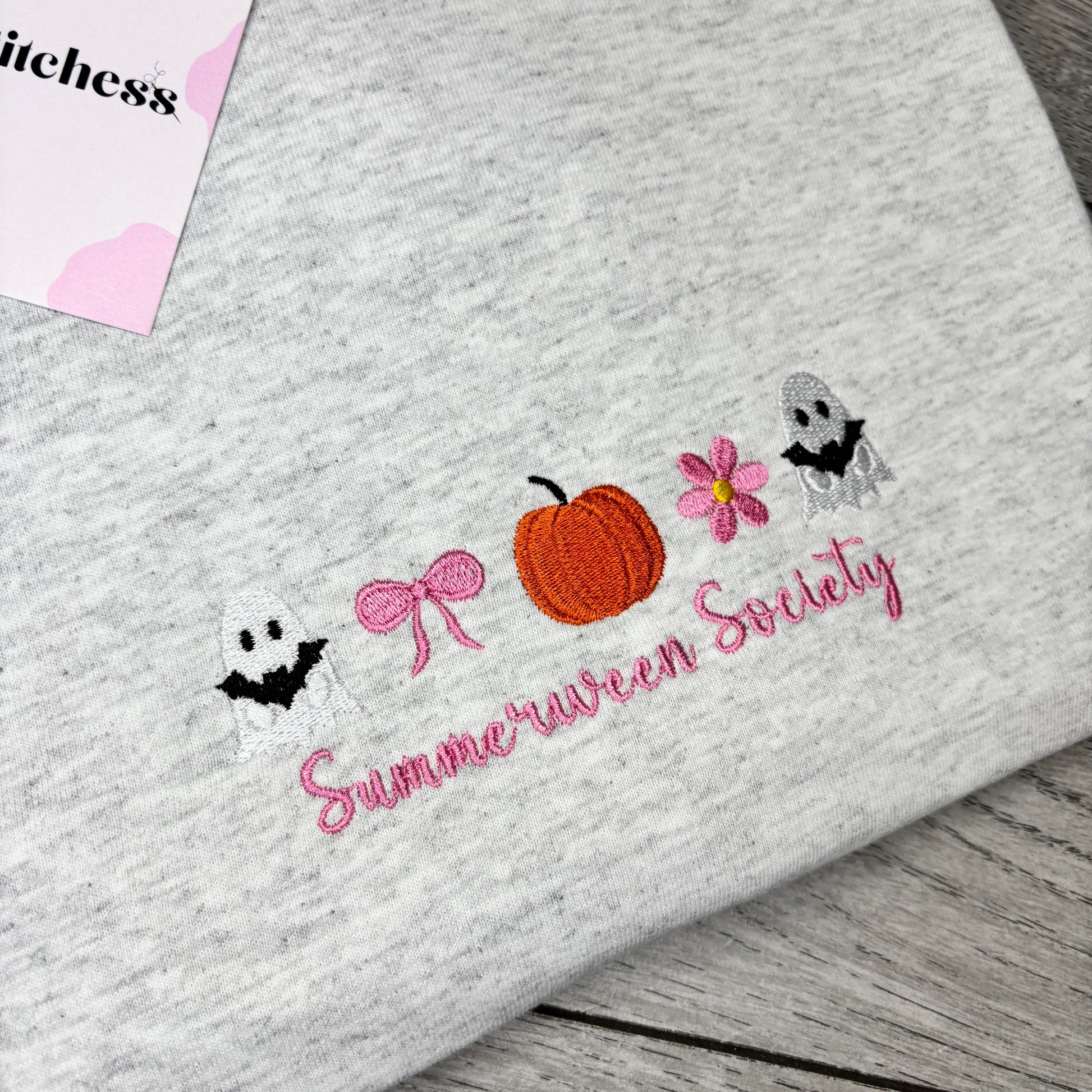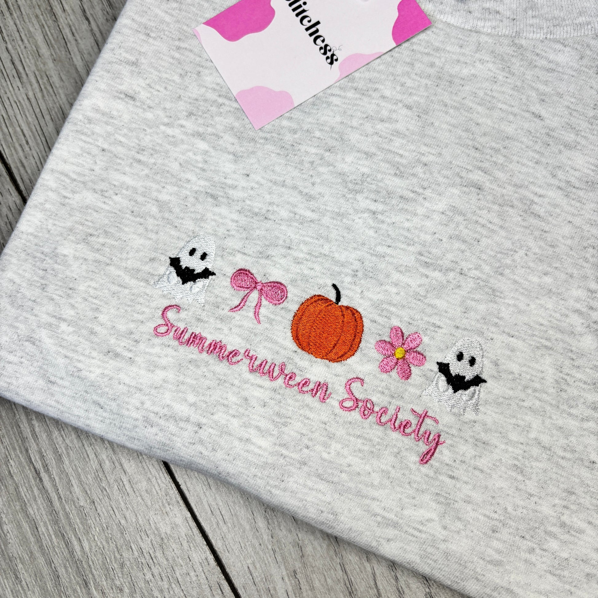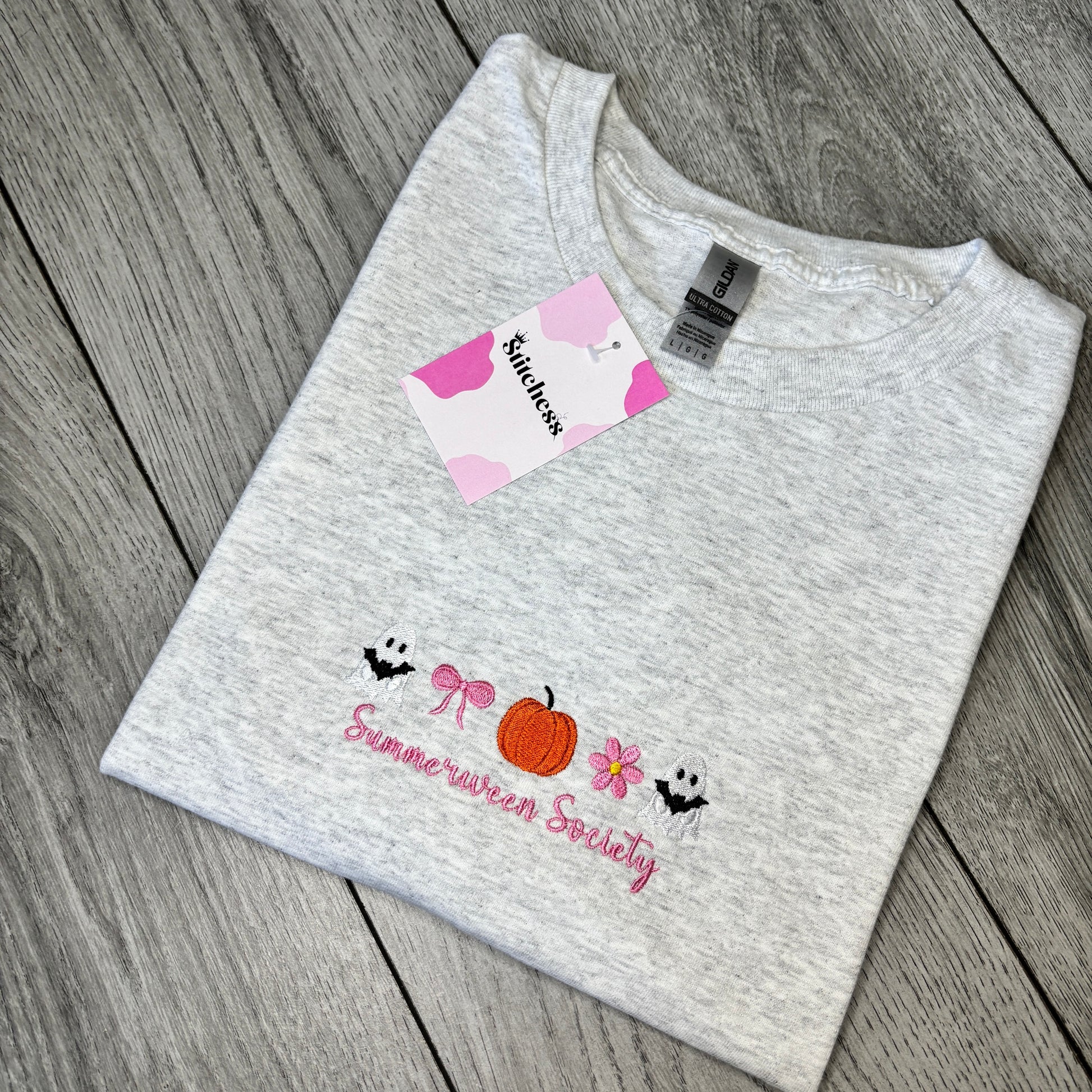 This SUMMERWEEN SOCIETY EMBROIDERED T-SHIRT/SWEATSHIRT is a must-have for Halloween fans. The cute embroidery and little icons make it the perfect choice for celebrating Summerween. Stay cool and stylish this holiday with this adorable top 🎃